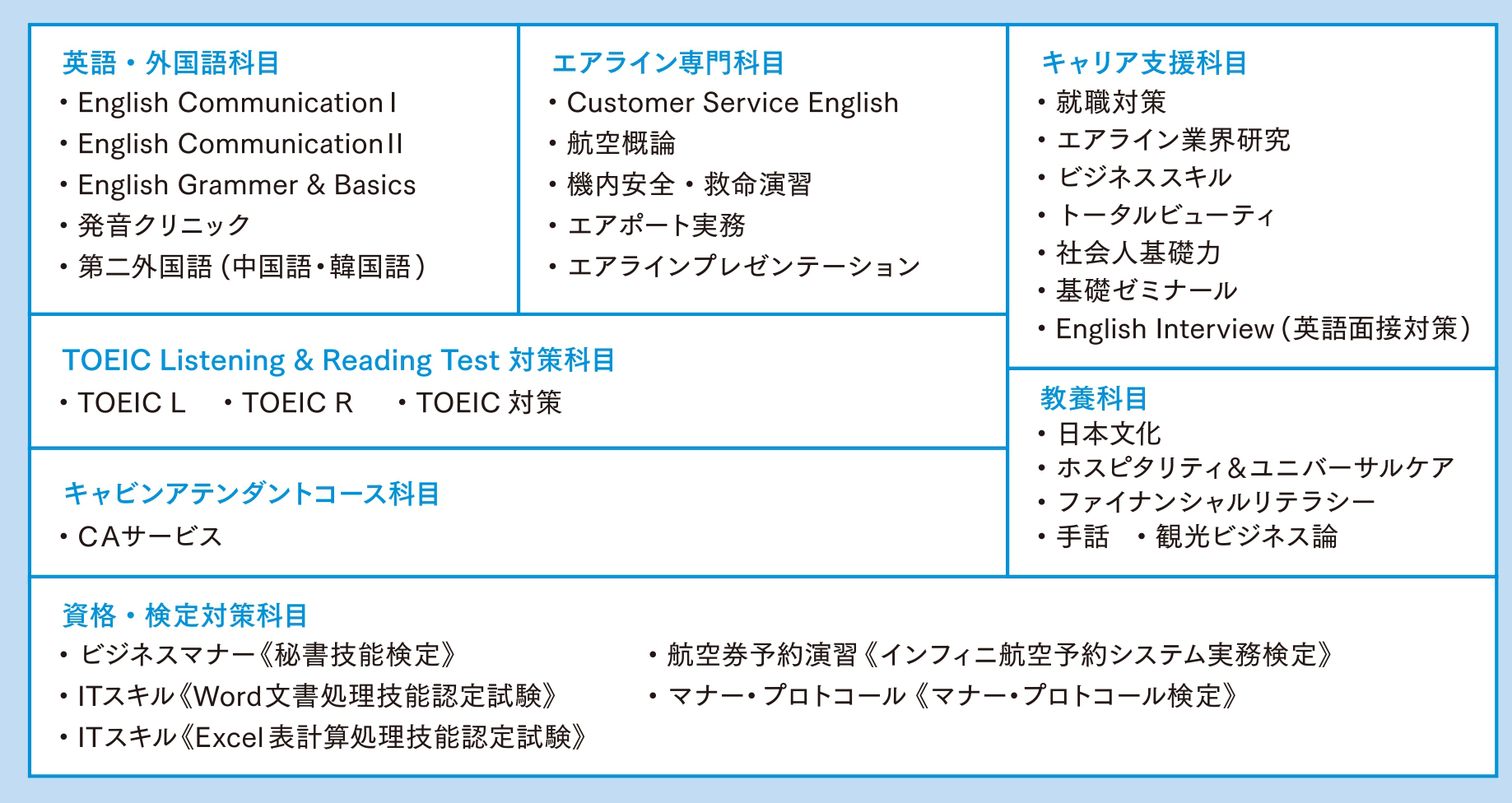CA出身の講師陣による本格的な指導で、業界で求められる高い語学力と専門知識・マナー・立ち居振る舞いを身に付けます。きめ細かい就職支援で憧れのC A 合格を目指します。